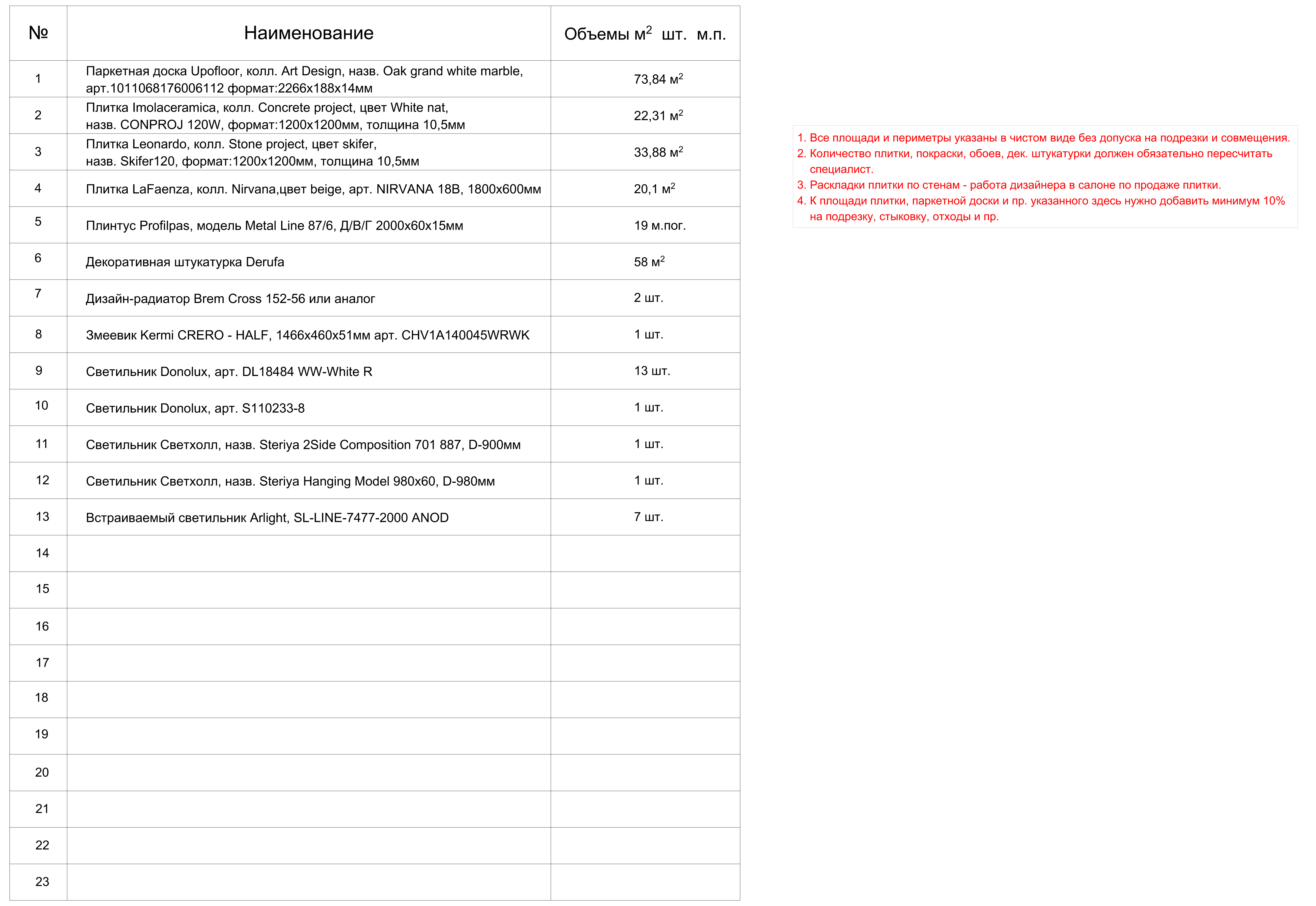 Спецификация по основным видам отделочных материалов (смотреть).